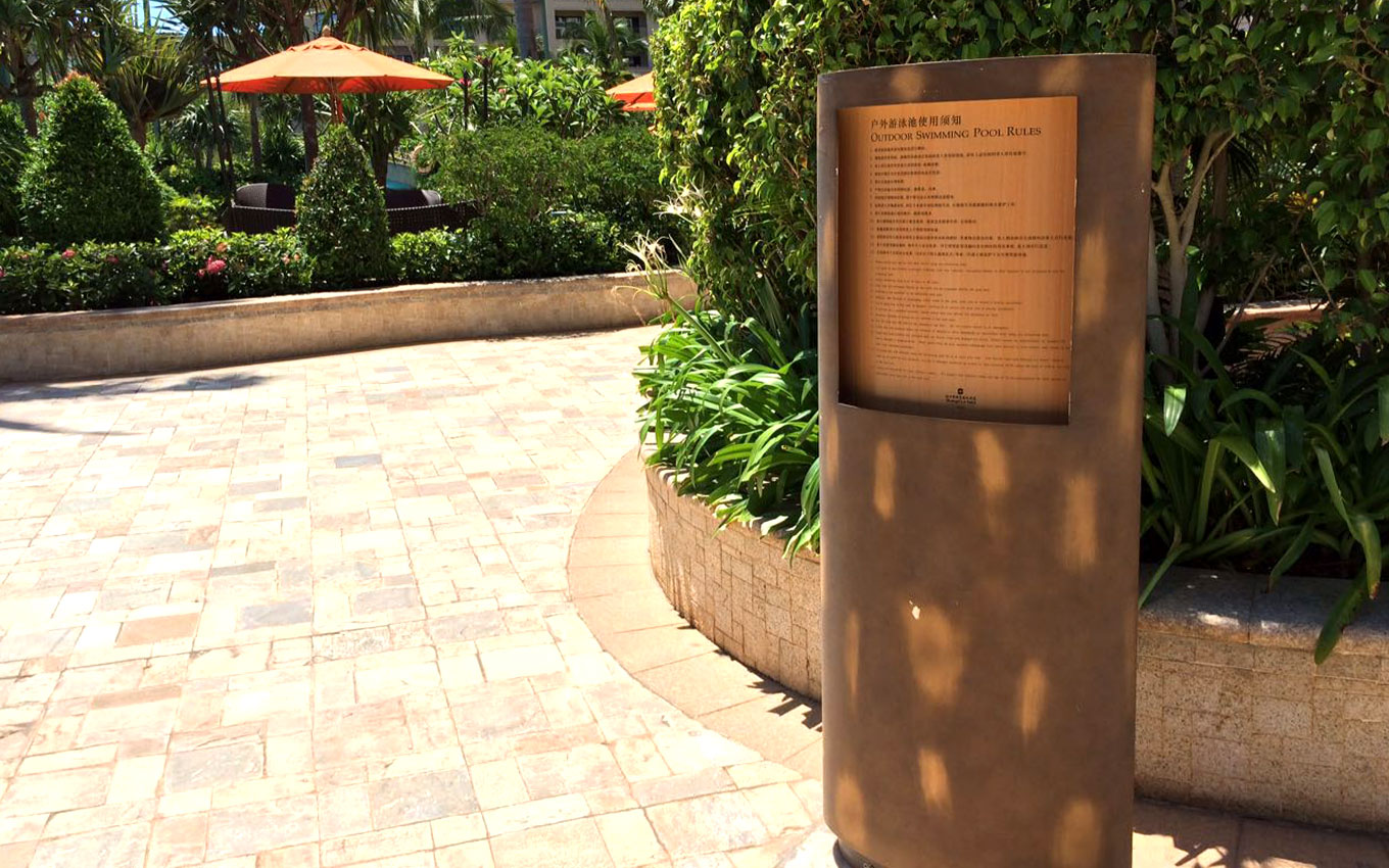 ??谙愀窭锢缶频晡挥诤?谑卸燃僦行?,海邊的天然美景、海岸線的風(fēng)光、椰風(fēng)的靜謐之處、這是??诙燃偬焯?,??谙愀窭锢缶频陿?biāo)識設(shè)計以海洋、??谝瑯滹L(fēng)光為設(shè)計創(chuàng)意,室外以古銅打造陽光下的度假方案導(dǎo)視設(shè)計,室內(nèi)以沙石雕花邊工藝制作,結(jié)合金屬質(zhì)感的點綴,形成鮮明的品質(zhì)感。